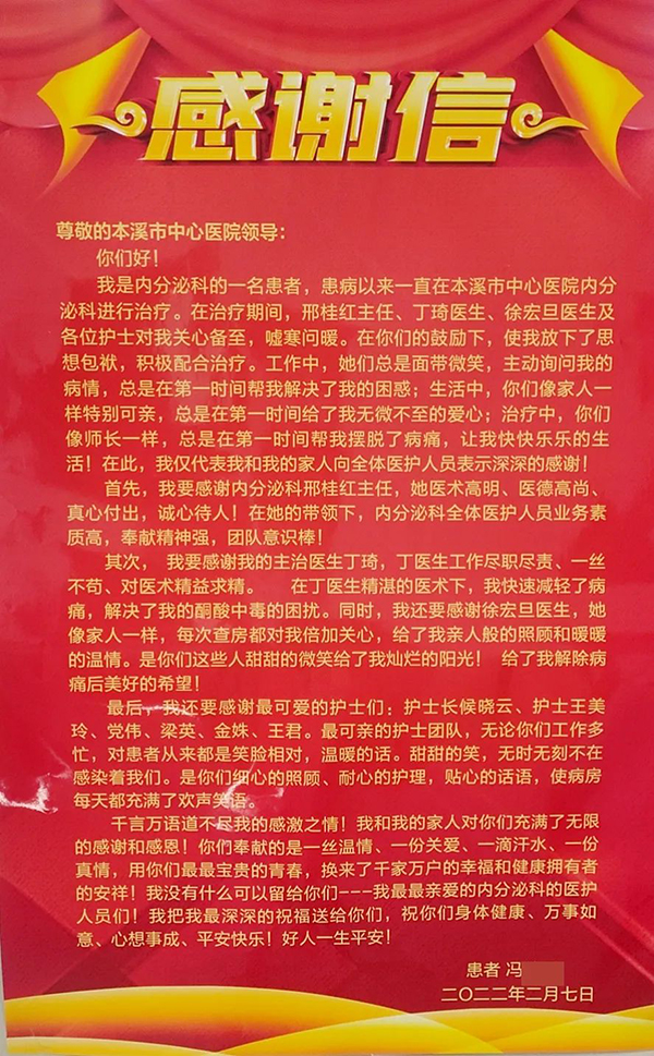 你们好,我是内分泌科的一名患者,患病以来一直在本溪市中心医院内分泌科治疗。在治疗期间,邢桂红主任、丁琦医生、徐宏旦医生及各位护士对我关心备至,嘘寒问暖。他们总是面带微笑,主动询问我的病情,总是在第一时间帮助我解决了我的困惑,总是在第一时间像家人一样给我无微不至的爱。他们帮我摆脱了病痛,让我快快乐乐的生活。在此,我仅代表我和家人向全体医护人员表示深深的感谢!